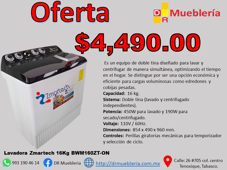 La Lavadora Zmartech Semi 16Kg (Modelo BWM160ZT-ON) es una lavadora semiautomática de doble tina diseñada para cargas pesadas y familias grandes. Su sistema permite lavar en una tina mientras se centrifuga en la otra, optimizando el tiempo y el uso de agua en comparación con modelos manuales.