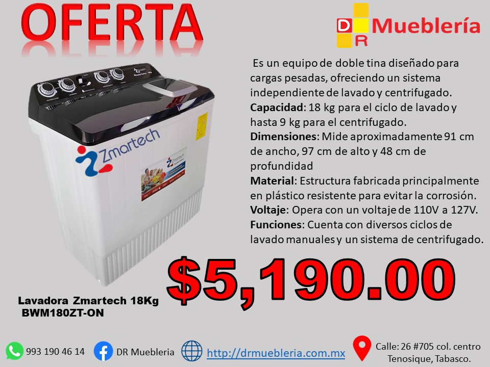 La Lavadora Semiautomática Zmartech de 18 kg (Modelo BWM180ZT-ON) es un equipo de doble tina diseñado para realizar procesos de lavado y centrifugado de manera independiente o simultánea.
